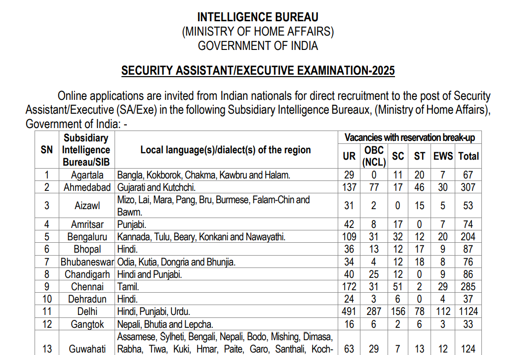 इंटेलिजेंस ब्यूरो (IB) सुरक्षा सहायक भर्ती 2025